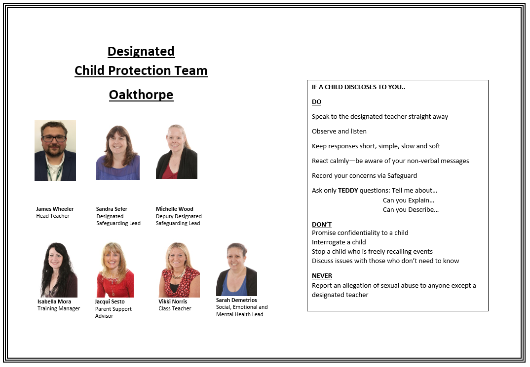 Safeguarding at Oakthorpe primary School is everyone’s responsibility. At Oakthorpe we are fully committed to providing an inclusive, safe and nurturing environment for children to thrive in all aspects of their life.